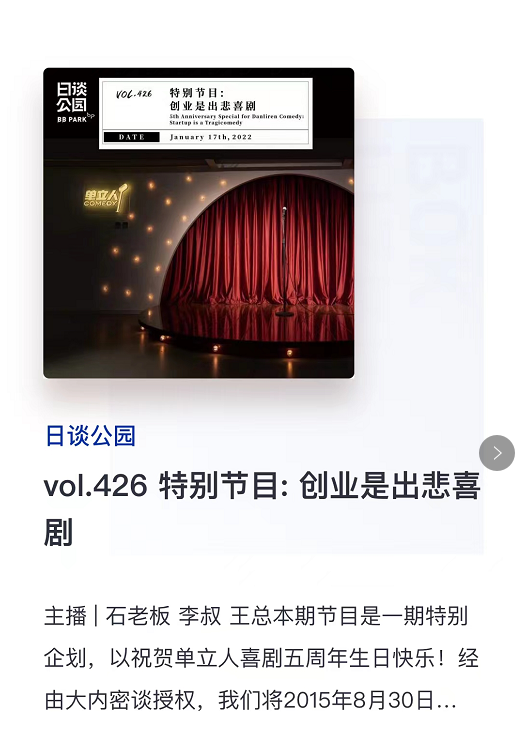 《日谈公园》是由文娱领域资深人士李叔(李志明)和小伙子(冯广健)共同主持的脱口秀播客节目,其并非是完全讲创业创新的播客,涉及的话题非常广。在这期聊创业的节目里,石老板从金融公司辞职,决定全职搞喜剧,创立单立人喜剧。他和老友李叔一起聊了聊创业这个话题,石老板表达了自己对于喜剧行业的热爱与期待,以及个人小小的创业目标。因为听上去过于不切实际,喜剧新人石老板在节目里被担心朋友走错路的李叔一通打击加嘲讽,丝毫不留情面,总结一个字就是:“你不行!”而历史的车轮滚滚向前,单立人喜剧如今五周年了,已经是中国最优秀的喜剧公司之一,为中国喜剧行业培养了大量优秀演员。创业是一出悲喜剧。