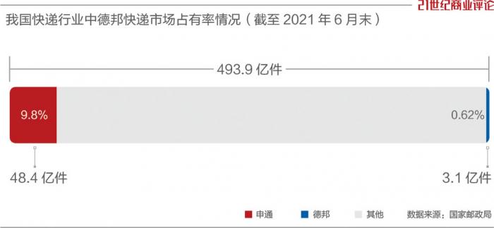 2021上半年,中国快递业务总量为493.9亿件,德邦快递业务为3.1亿件,占据市场份额为0.62%,比“通达系”垫底的申通(市占率9.8%),都差得很远。
