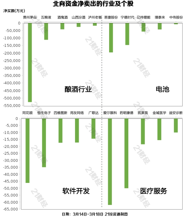 同时,北向资金重点减持酿酒行业,净卖出金额高达73.18亿元。其中,白酒股贵州茅台(600519.SH)被净卖出52.69亿元,五粮液(000858.SZ)被净卖出11.23亿元,两者合计被净卖出63.92亿元。此外,电池板块遭北向资金净减持40.39亿元,软件开发、医疗服务、互联网服务等板块均被净减持10亿元以上。
