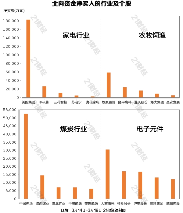当周,北向资金累计增持最多的是家电行业,净额为11.33亿元,紧随其后的是农牧饲渔、煤炭行业、电子元件板块。