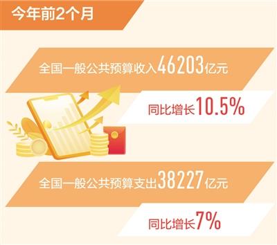 财政部18日公布今年前2个月全国财政收支数据。前2个月,全国一般公共预算收入46203亿元,同比增长10.5%。其中,中央一般公共预算收入22771亿元,同比增长11.3%;地方一般公共预算本级收入23432亿元,同比增长9.8%。全国税收收入40812亿元,同比增长10.1%;非税收入5391亿元,同比增长13.7%。
