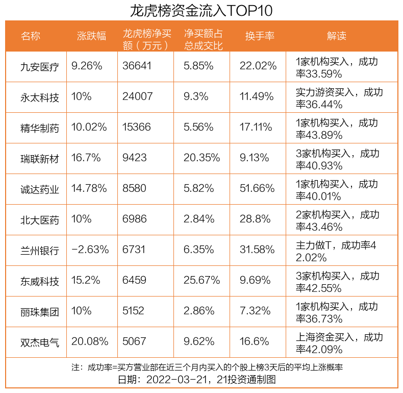 3月21日,上证指数上涨0.08%,深证成指上涨0.41%,创业板指上涨0.46%。盘后龙虎榜数据显示,共有38只个股因当日异动登上龙虎榜,资金净流入最多的是九安医疗(002432.SZ),达3.66亿元。