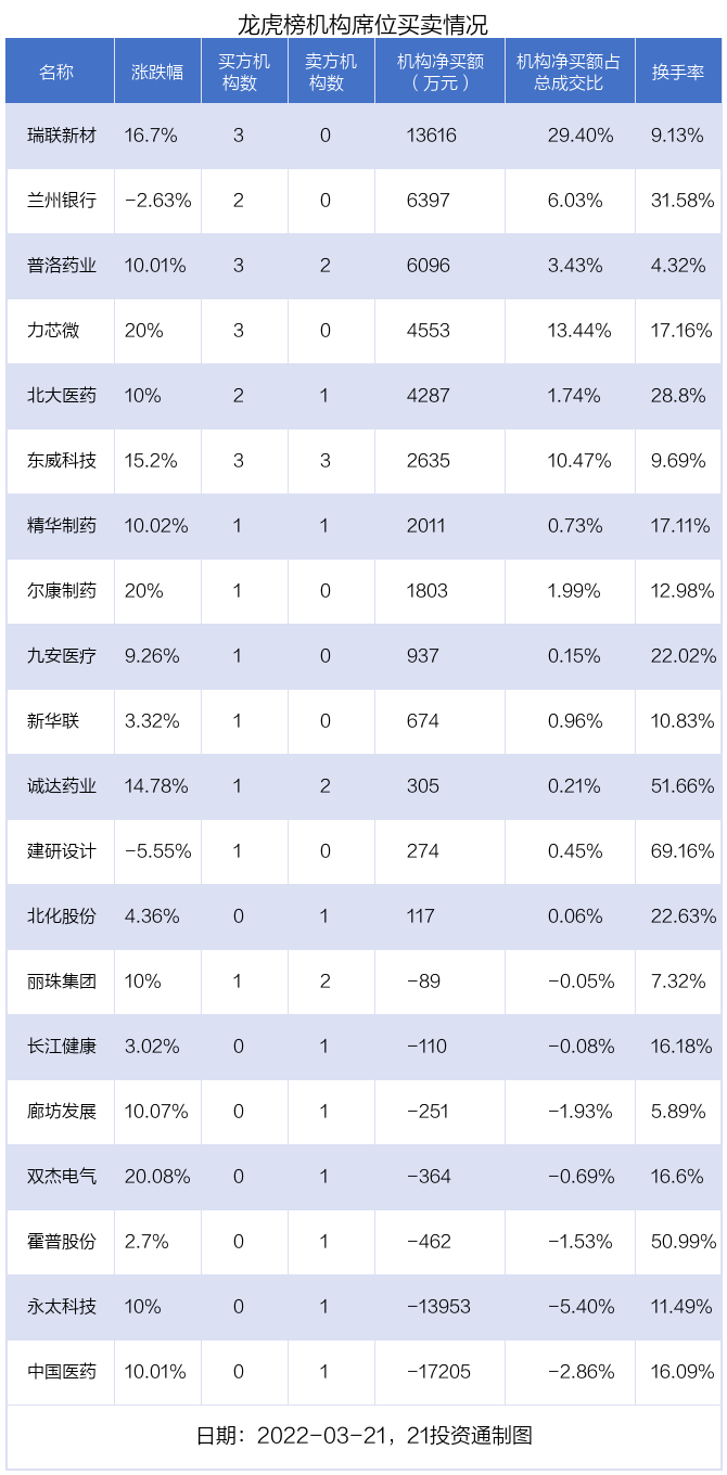 3月21日,20只个股龙虎榜出现了机构的身影,机构合计净买入1.13亿元。具体来看,机构净买入13股,净卖出7股。