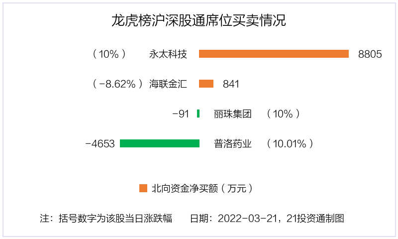 3月21日,北向资金参与龙虎榜中的个股共有4只,合计净买入4901.36万元。其中深股通净买入2股,净卖出2股,合计净买入4901.36万元。