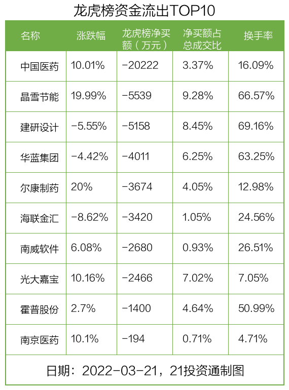 而龙虎榜中资金净流出最多的是中国医药(600056.SH),被净卖出为2.02亿元,占总成交金额的3.37%。中国医药收盘上涨10.01%,换手率为16.09%。