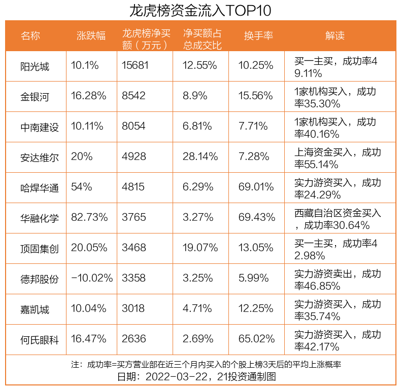 3月22日,上证指数上涨0.19%,深证成指下跌0.49%,创业板指下跌1.39%。盘后龙虎榜数据显示,共有50只个股因当日异动登上龙虎榜,资金净流入最多的是阳光城(000671.SZ),达1.57亿元。