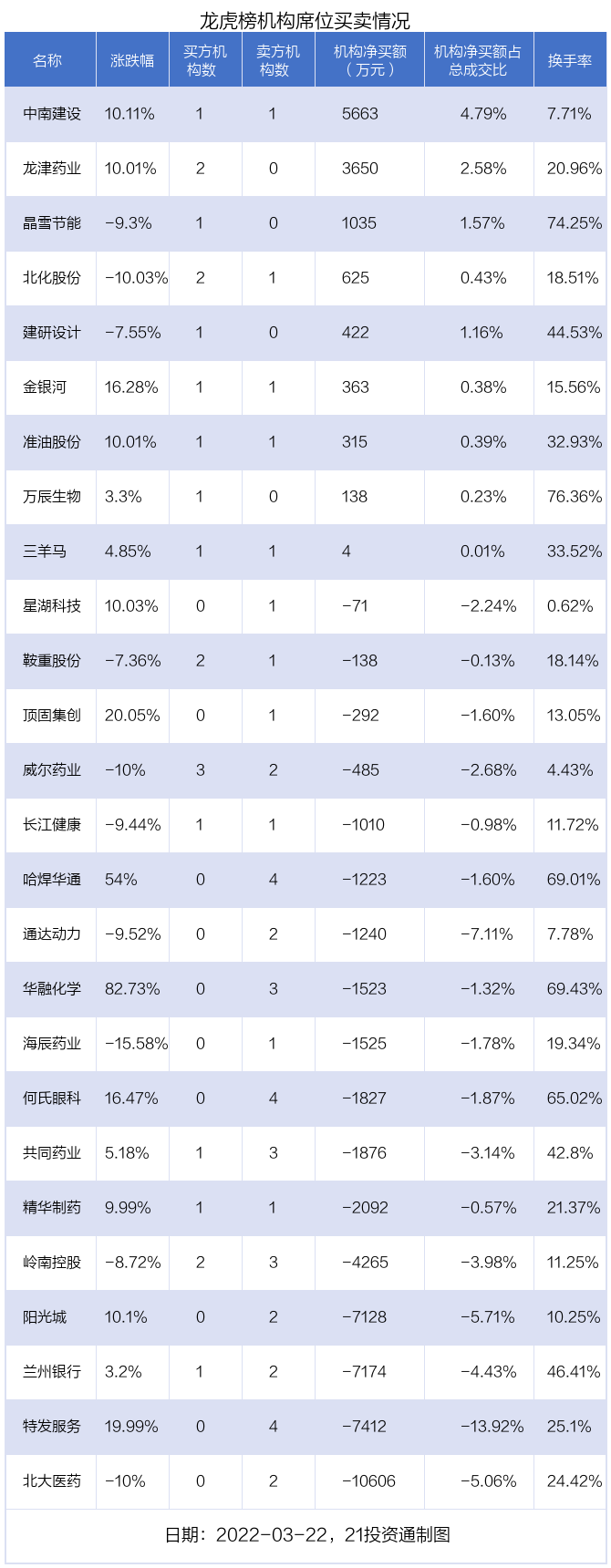 据21投资通(微信号ID:touzit21)智能监测,26只个股龙虎榜出现了机构的身影,北向资金参与龙虎榜中的个股共涉及4只。