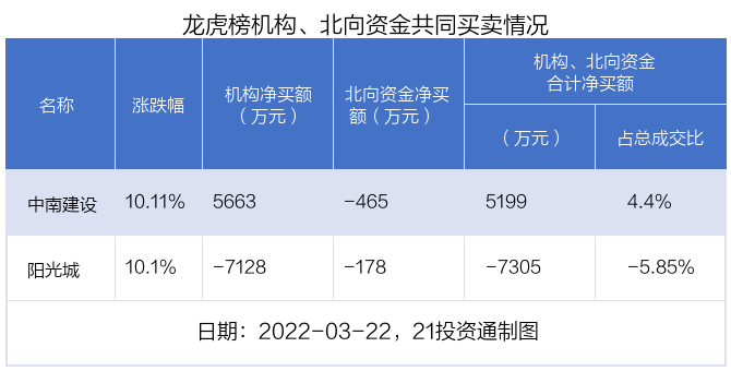 值得注意的是,机构和北向资金共同净卖出了阳光城;在中南建设上出现分歧,机构净买入中南建设5663.22万元,北向资金净卖出464.66万元。