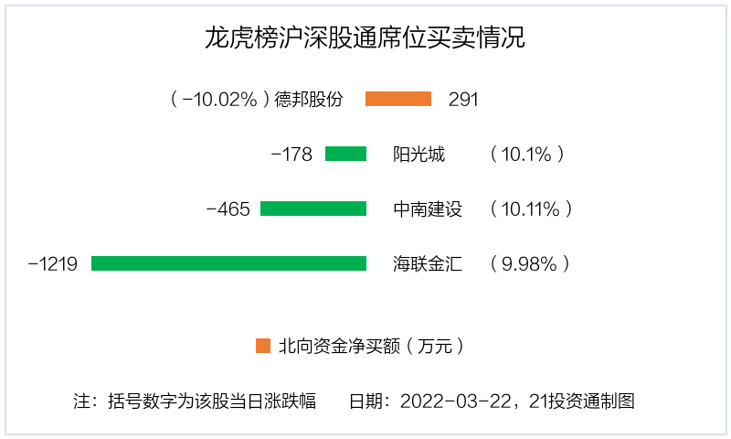 3月22日,北向资金参与龙虎榜中的个股共有4只,合计净卖出1569.79万元。其中沪股通净买入1股,净买入291.32万元;深股通净卖出3股,合计净卖出1861.11万元。