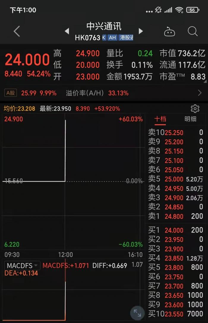 中兴通讯港股复牌直线拉升,一度涨超50%。