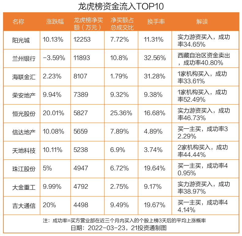 3月23日,上证指数上涨0.34%,深证成指上涨0.73%,创业板指上涨1.03%。盘后龙虎榜数据显示,共有46只个股因当日异动登上龙虎榜,资金净流入最多的是阳光城(000671.SZ),达1.23亿元。