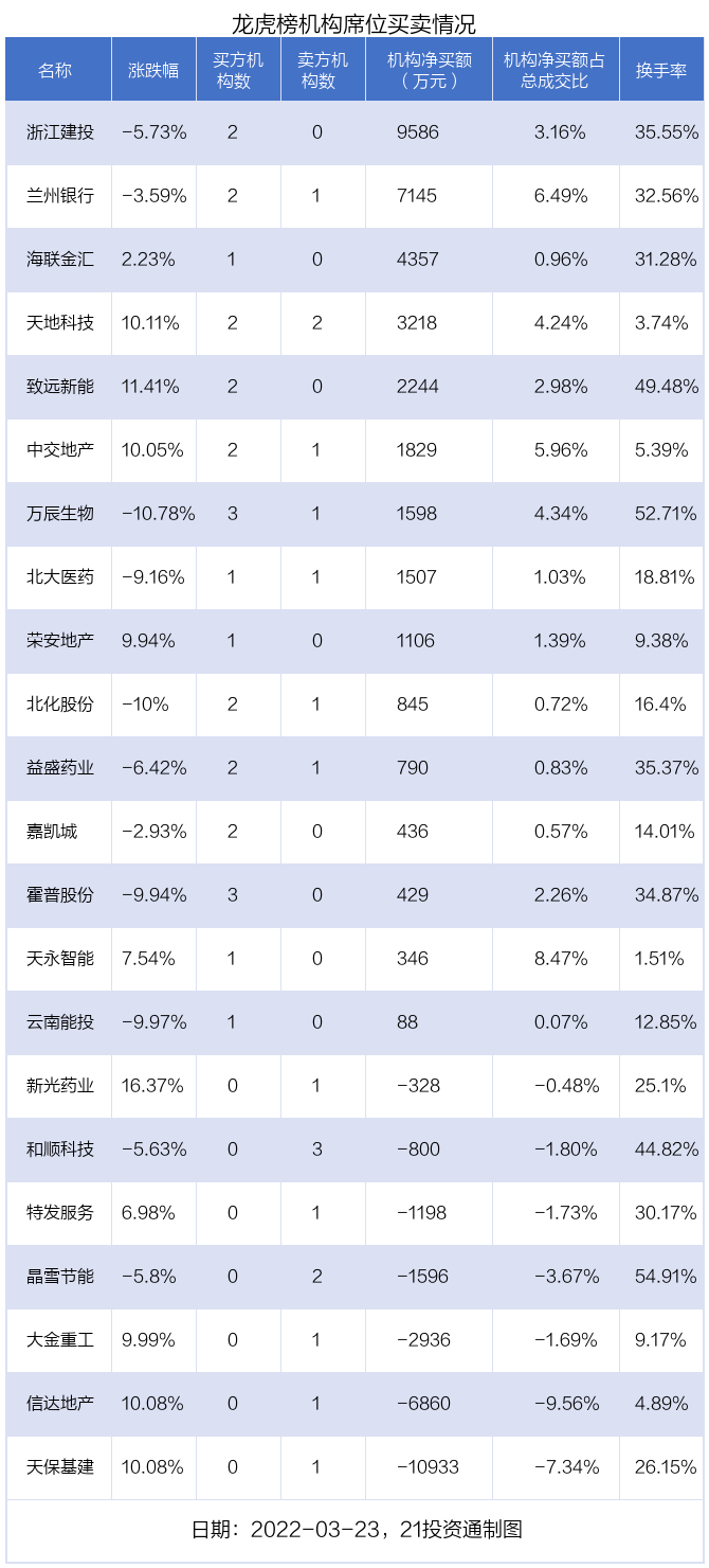 3月23日,22只个股龙虎榜出现了机构的身影,机构合计净买入1.09亿元。具体来看,机构净买入15股,净卖出7股。