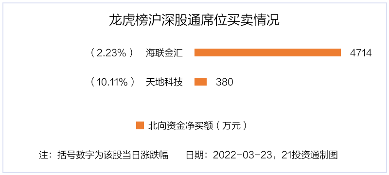 3月23日,北向资金参与龙虎榜中的个股共有2只,合计净买入5093.8万元。其中沪股通净买入天地科技(600582.SH),为380.19万元,占总成交金额的0.5%,当日收盘上涨10.11%,换手率为3.74%;深股通净买入海联金汇(002537.SZ),净买入4713.61万元,占总成交金额的1.04%。