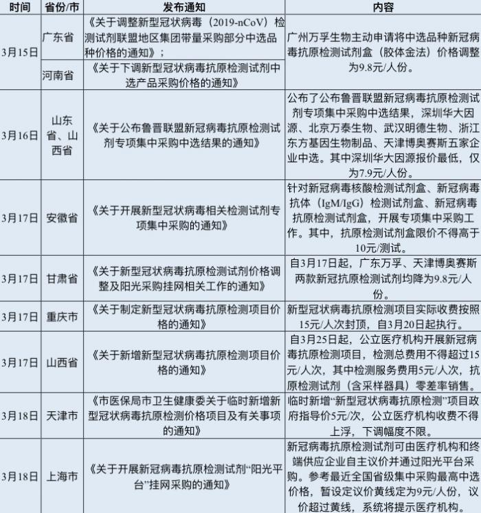 随后,安徽、甘肃、重庆、山西等省市也陆续发表通知,公示新冠抗原检测试剂集采价格及新型冠状病毒抗原检测项目指导价。