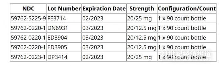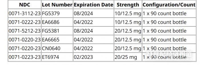 召回产品的NDC、批号、有效期和配置详情 来源:辉瑞官网