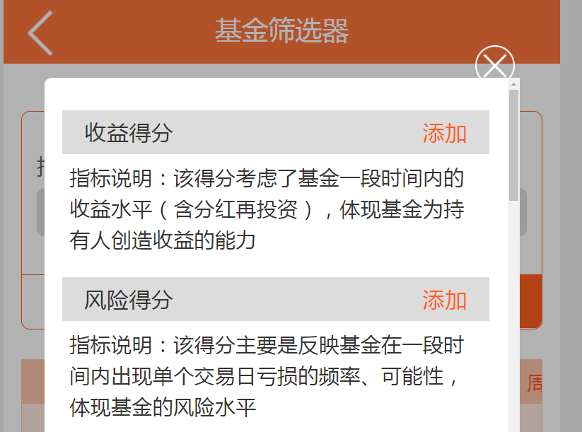 通过“添加新指标”,选取偏好的侧重指标。比如,在筛选适合定投的基金时,我们可以添加“最终得分”+“收益得分”+“风险得分”三个指标。从而达到综合得分托底,收益和风险侧重,通过定投将波动“熨平”,进而追逐理想收益。