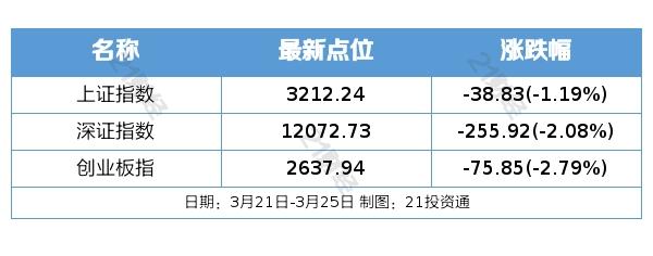过去一周,A股三大指数集体收跌,上证指数周跌1.19%,深证成指周跌2.08%,创业板指数周跌2.79%。