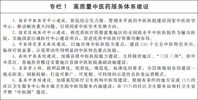 ——中医药服务体系进一步健全。融预防保健、疾病治疗和康复于一体的中医药服务体系逐步健全,中医药基层服务能力持续提升,中西医结合服务水平不断提高,中医药参与新发突发传染病防治和公共卫生事件应急处置能力显著增强。