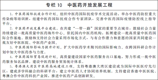 2.深化中医药交流合作。巩固拓展与有关国家的政府间中医药合作,加强相关政策法规、人员资质、产品注册、市场准入、质量监管等方面的交流。鼓励和支持有关中医药机构和团体以多种形式开展产学研用国际交流与合作。促进中医药文化海外传播与技术国际推广相结合。鼓励和支持社会力量采用市场化方式,与有合作潜力和意愿的国家共同建设一批友好中医医院、中医药产业园。加强与港澳台地区的中医药交流合作,建设粤港澳大湾区中医药高地,打造高水平中医医院、中医优势专科、人才培养基地和科技创新平台。