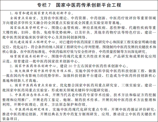 3.建设高层次科技平台。依托现有资源,建设一批国家级中医药研究平台,研究布局全国重点实验室、国家临床医学研究中心、国家工程研究中心和国家技术创新中心;推进国家中医药传承创新中心、国家中医临床研究基地和中国中医药循证医学中心建设。发挥中国中医科学院“国家队”作用,实施中医药科技创新工程。