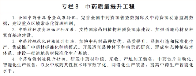 3.提升中药产业发展水平。健全中药材种植养殖、仓储、物流、初加工规范标准体系。鼓励中药材产业化、商品化和适度规模化发展,推进中药材规范化种植、养殖。鼓励创建以中药材为主的优势特色产业集群和以中药材为主导的农业产业强镇。制定实施全国中药饮片炮制规范,继续推进中药炮制技术传承基地建设,探索将具有独特炮制方法的中药饮片纳入中药品种保护范围。加强中药材第三方质量检测平台建设。研究推进中药材、中药饮片信息化追溯体系建设,强化多部门协同监管。加快中药制造业数字化、网络化、智能化建设,加强技术集成和工艺创新,提升中药装备制造水平,加速中药生产工艺、流程的标准化和现代化。