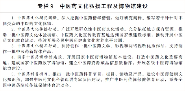 1.加强中医药文化研究和传播。深入挖掘中医药精华精髓,阐释中医药文化与中华优秀传统文化的内在联系。加强中医药学与相关领域协同创新研究。实施中医药文化传播行动,推动建设体验场馆,培育传播平台,丰富中医药文化产品和服务供给。推动中医药文化贯穿国民教育始终,进一步丰富中医药文化教育。加强中医药机构文化建设。加大对传统医药类非物质文化遗产代表性项目的保护传承力度。加强中医药科普专家队伍建设,推动中医医疗机构开展健康讲座等科普活动。建设中医药健康文化知识角。开展公民中医药健康文化素养水平监测。