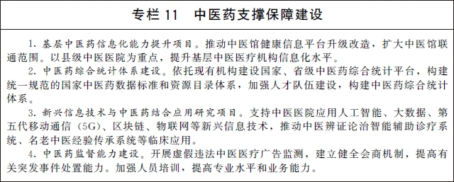 1.加强中医药传承保护。实施中医药古籍文献和特色技术传承专项,编纂出版《中华医藏》,建立国家中医药古籍和传统知识数字图书馆。加强对名老中医学术经验、老药工传统技艺等的活态传承,支持中医学术流派发展。推动出台中医药传统知识保护条例,建立中医药传统知识数据库、保护名录和保护制度。