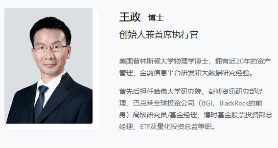 王政为通联数据创始人兼首席执行官,为美国普林斯顿大学物理学博士,曾先后担任哈佛大学研究院、彭博资讯研究部经理、巴克莱全球投资公司(BGI,BlackRock的前身)高级研究员/基金经理。