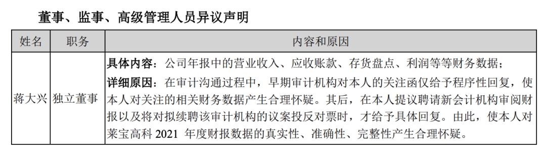 原来,蒋大兴称,在审计沟通过程中,早期审计机构对本人的关注函仅给予程序性回复,使本人对关注的相关财务数据产生合理怀疑。其后,在本人提议聘请新会计机构审阅财报以及将对拟续聘该审计机构的议案投反对票时,才给予具体回复。由此,使本人对莱宝高科2021年度财报数据的真实性、准确性、完整性产生合理怀疑。
