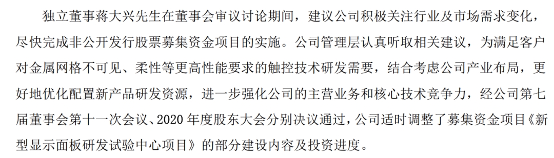 年报还披露了4位独立董事在履职期间的重点关注,蒋大兴关注的是积极关注市场需求,完成增发募资项目实施。莱宝高科表示已适时调整了募资项目。