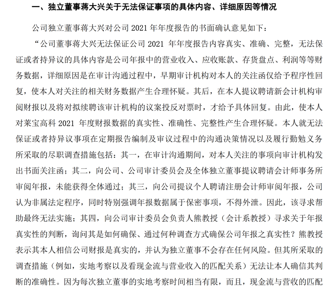 年报中,莱宝高科提示,独立董事蒋大兴无法保证公司2021年年度报告内容真实、准确、完整,无法保证或者持异议的具体内容是公司年报中的营业收入、应收账款、存货盘点、利润等等财务数据,请投资者特别关注。