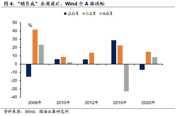 对比过往5轮“销售底”出现前1个季度(含当月),及出现后第1个季度、第2个季度的大盘表现,我们发现“销售底”出现后1个季度,通常是中期内股市大盘表现较好的时候。