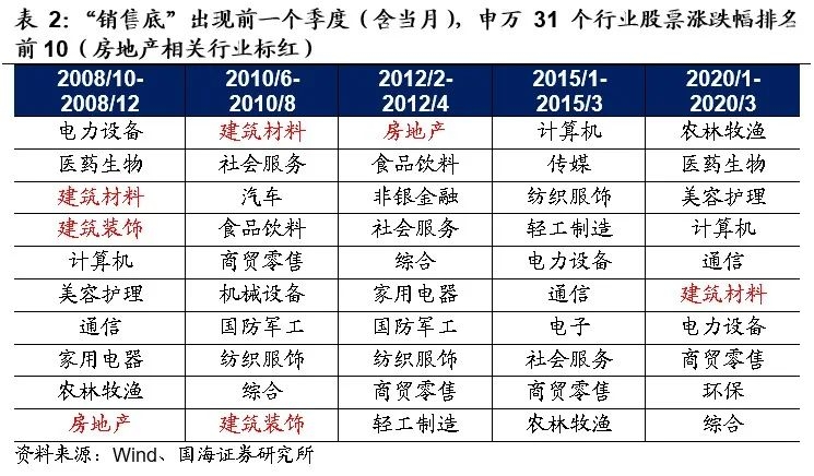 历史上,在“销售底”出现之前,经济基本面总体仍处于衰退末期中,股市缺乏较多的投资机会。在此情况下,受到政策乐观情绪影响的房地产板块,通常表现能够超越大盘(如表2)。而目前“稳地产”政策正在陆续推出,带来房地产板块相应的投资机会,同样值得关注。