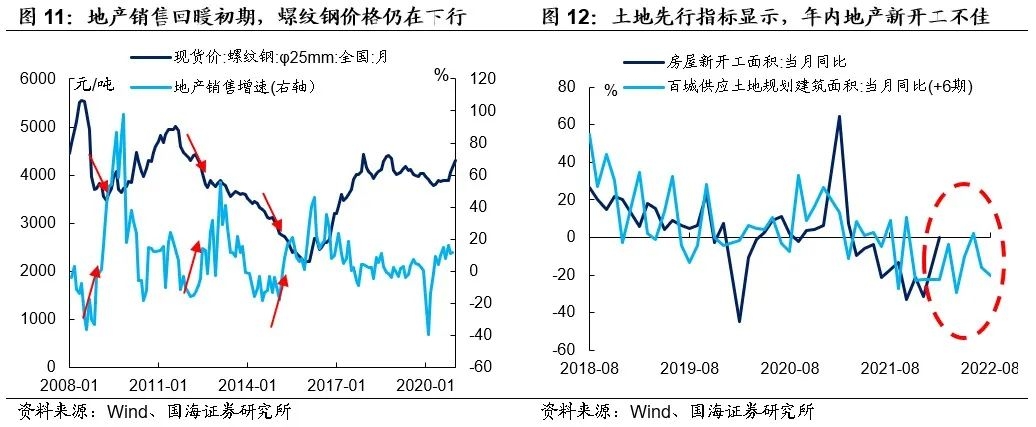 但需要注意的是,由于地产销售回暖领先于地产投资回暖(“政策底”-“销售底”-“拿地底”-“新开工/投资底”,具体传导逻辑参考本系列第一篇报告),销售数据与上游商品价格趋势并不同步。