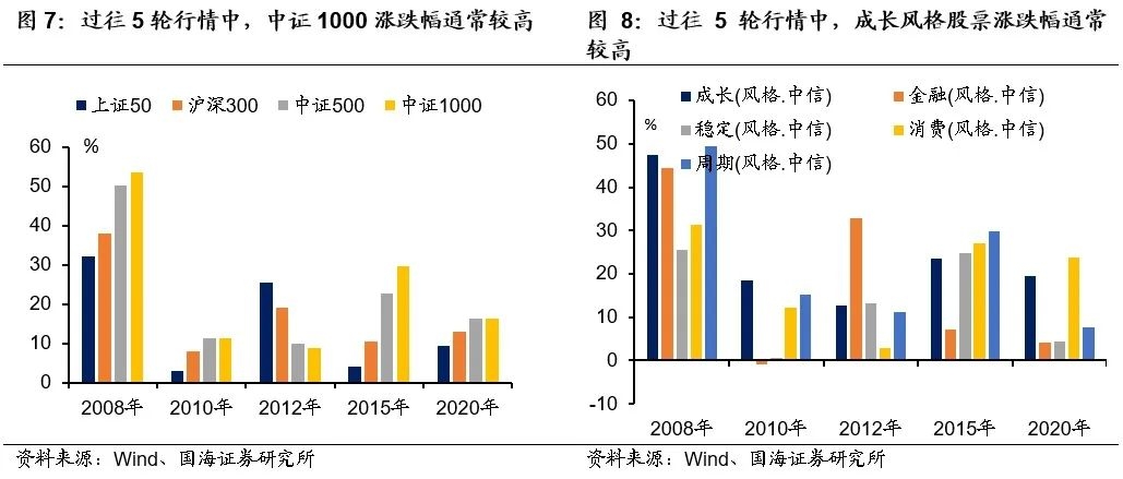 进一步地研究历史上5轮“销售底”出现后1个季度、大盘全面上涨的行情中,各个细分板块表现,我们发现:从市值的角度,有弹性的小盘股表现通常较优;从风格的角度,有进攻性的成长股表现通常较好。