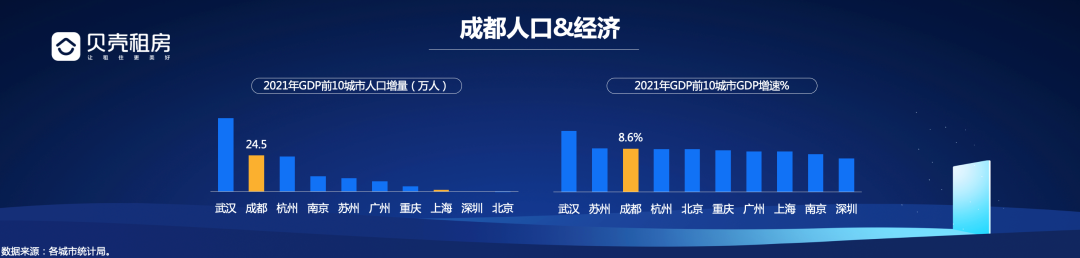 2021年GDP总量前10的城市,成都常住人口2119.2万人,人口增量24.9万,10个城市中排名第2,依然保持强劲的人口吸附力;同样在经济增速方面,成都GDP增速以8.6%的增速领跑全国,排名GDP总量前10城市中的第3。