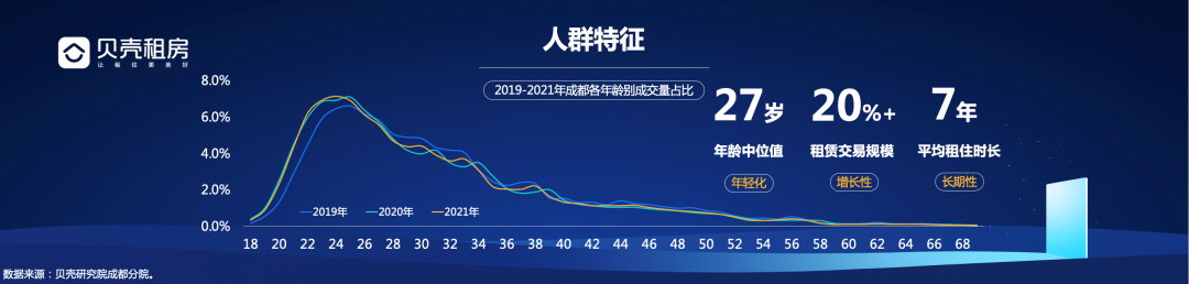 从2019年到2021年,成都租赁人群的年龄中位值由29岁缩小至27岁,年轻化的趋势越发明显。