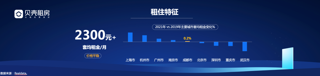 2021年,在成都整租一套的平均租金约2300元,与两年前疫情前的价格基本持平。与国内同能级城市相比,无论在租金的可负担性还是租金的涨幅水平上,都非常有竞争力,这也许也是年轻人愿意来到成都生活工作的原因之一。