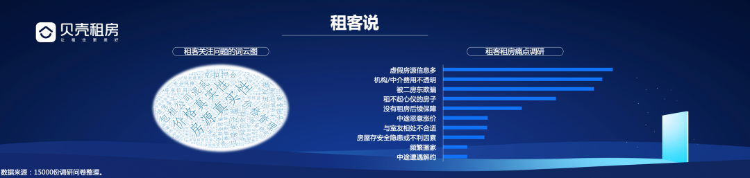 从租客的角度,从线下的1万多份问卷分析可以看到,对于租金价格的真实性以及房源的真实性诉求最大。具体来看,他们面临的最大痛点是虚假房源信息多,当然这也是住房租赁市场管理的一大痛点,不法人员以虚假房源吸引客户等现象屡禁不止,尤其是对涉世不深的年轻人而言,上当受骗事件时有发生。其次,机构费用不透明、被二房东、包租公司欺骗也是年轻的租客比较关注的痛点,近年来,租客遭遇二房东跑路的事件层出不穷,他们采取长收短付、高收低租的方式,套取资金后“人间蒸发”。二房东、包租公司卷款跑路事件已然成为租赁市场的一颗毒瘤。