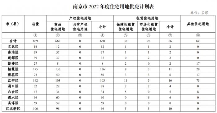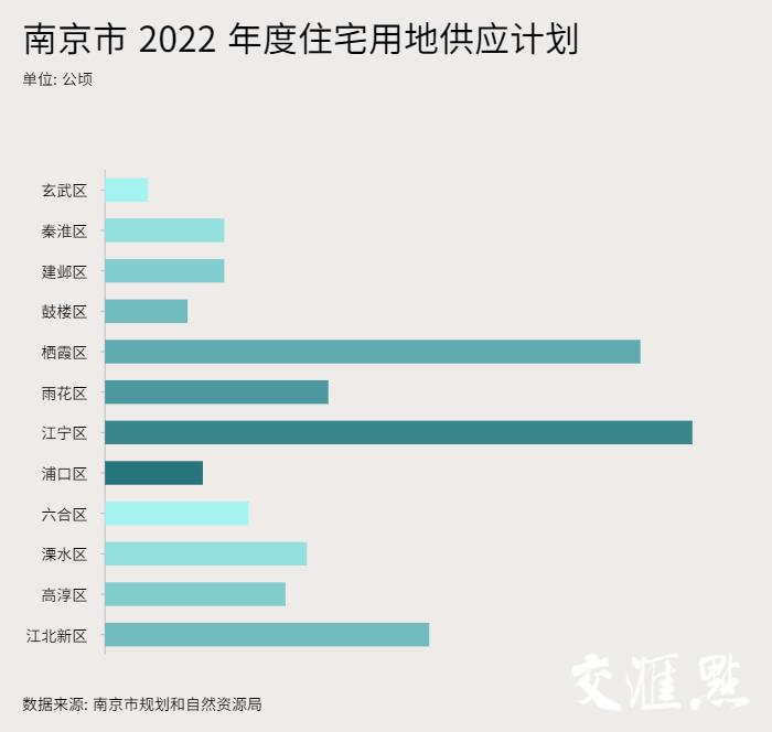 近日,南京市规划和自然资源局公布的2022年南京宅地供应计划显示,2022年南京住宅用地计划供应869公顷,其中,商品住宅用地660公顷,保障性租赁住宅用地38公顷。具体到各区,玄武区计划供应面积最小,为14公顷;江宁区、栖霞区、江北新区成供应“大户”,分别为192、175、106公顷。