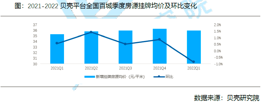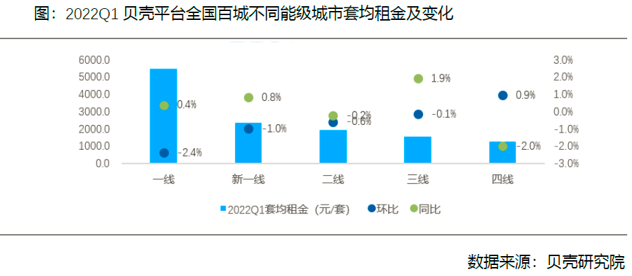 全国百城租赁房源成交周期走高,业主出租信心减弱。根据贝壳研究院数据,一季度百城房源成交周期为67天,环比延长16.1天,同比延长4.9天,客源成交周期为10.6天,环比基本持平,同比延长0.4天。房源出租难度提升,主要是春节假期的影响,以及部分区域疫情影响,业主出租信心减弱,一季度百城新增挂牌房源均价为35.9元/平米,环比下跌0.9%。