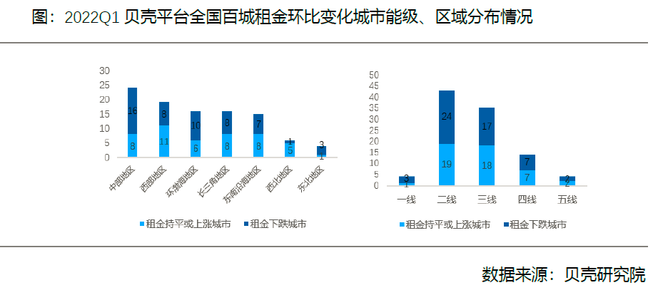 ■ 根据贝壳研究院数据,一季度全国百城租赁成交量环比增加7.3%,70个城市租赁成交量环比增加,30个城市租赁市场环比降温。全国百城中仅31个城市3月租赁成交环比增加超过10%,41个城市租赁成交环比减少。