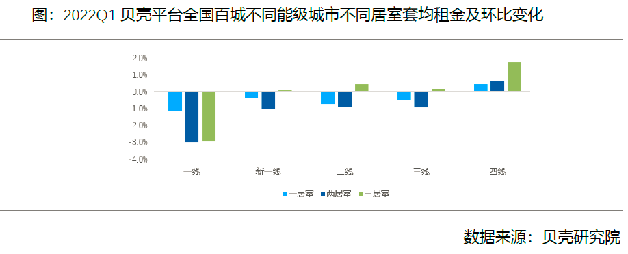 一线城市租金环比微跌,其他能级城市租金环比持平或微涨。根据贝壳研究院数据,一季度一线城市租金环比微跌2.6%,主要是受到疫情影响,新一线城市、二线城市租金环比基本持平,三、四线城市租金环比微涨。从同比来看,一季度一线、新一线、三线城市租金同比微涨,涨幅不超过3%。从套均租金来看,除了四线城市外,其余能级城市套均租金均环比下跌,不过从同比来看,除了四线城市外,其余能级城市套均租金均同比微涨,涨幅不超过2%;分居室来看环比变化,除四线城市外,其余能级城市一居室、两居室租金均呈现环比微跌,一线城市三居室环比微跌2.9%,其余能级城市三居室环比微涨或持平。