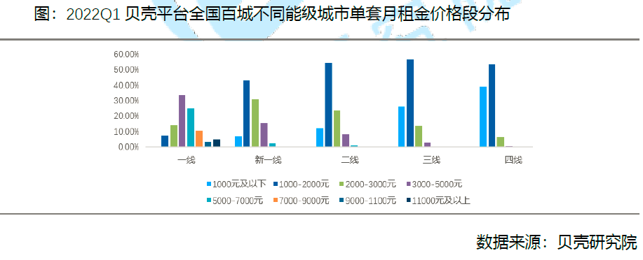 二线及以下能级城市租赁房源单套月租金多集中在3000元以内。根据贝壳研究院数据,一季度一线城市租赁房源中单套月租金为3000-5000元的成交占比最高超过30%,其次为5000-7000元,新一线城市成交占比最高的为1000-2000元,其次为2000-3000元,二线、三线、四线城市成交占比最高的为1000-2000元,占比超过50%,不同房源单套月租金价格段的占比在季度之间变化不大。