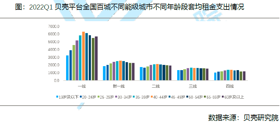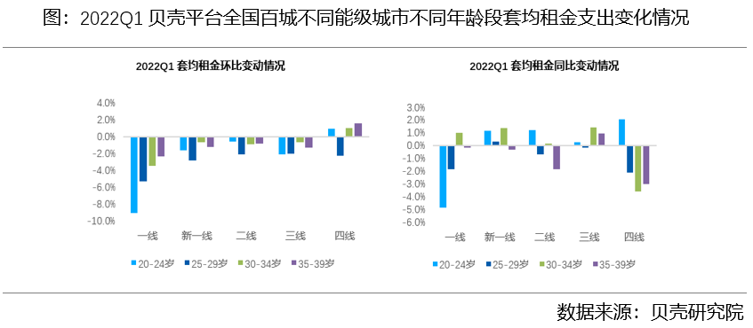 ■ 根据贝壳研究院数据,一季度一线城市租金环比微跌2.6%,其他能级城市租金环比持平或微涨,二线及以下能级城市租赁成交单套月租金多集中在3000元以内。除四线城市外,其余各能级城市20-39岁年龄段套均支出均环比减少。