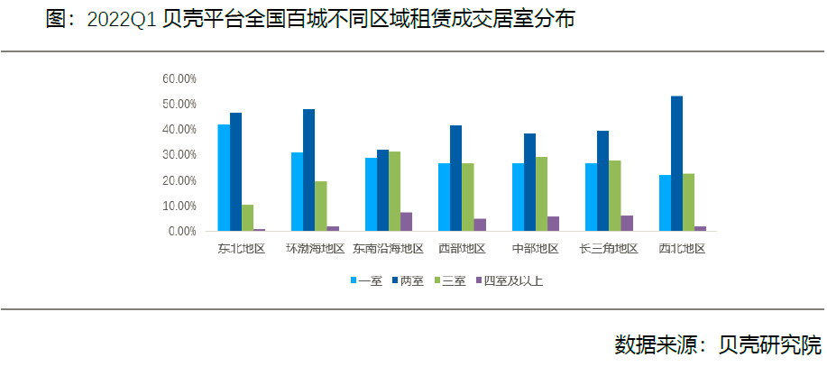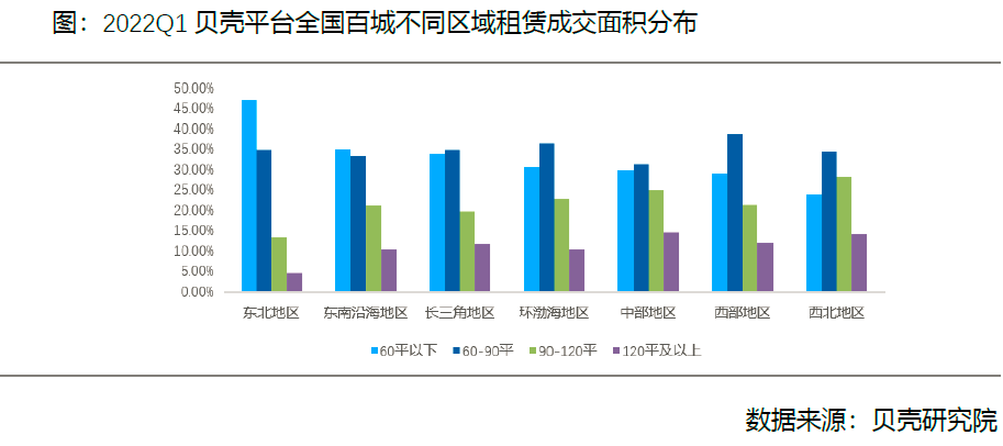 全国百城租赁成交中,居室结构两居室占比最高,面积结构60-90平米占比最高。根据贝壳研究院数据,一季度全国百城租赁成交中,两居室占比达到41.2%,其次为一居室占比达到28.6%,三居室占比为25.4%;分区域来看,各区域两居室占比均为最高,其中东北地区小户型占比较高,一居室、两居室占比均超过40%;东南沿海地区一居室、两居室、三居室分布较为均匀,其占比均在30%左右。面积结构方面,60平以下、60-90平米占比均超过30%,90-120平米的占比为21.6%;分区域来看,东北地区、东南沿海地区60平米以下居室占比最高,其他区域60-90平米占比最高。