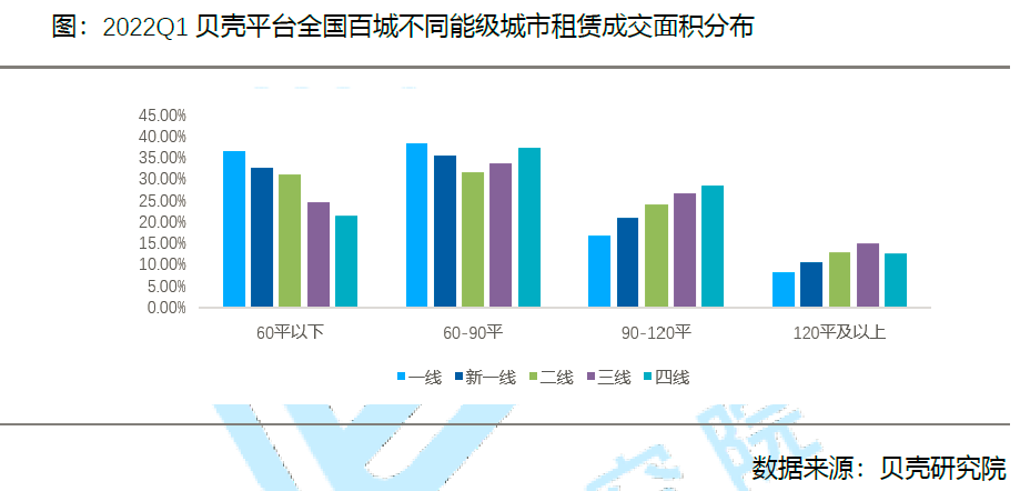 面积方面,随着城市能级提高60平米以下成交占比增加,90-120平米成交占比减少。根据贝壳研究院数据,各能级城市租赁成交中60-90平米租赁房源占比最高,均超过30%,60平米以下和90-120平米占比差异较大,一线、新一线及二线城市60平米成交占比超过30%,一线城市达到36.7%,四线城市一居室成交占比最低为21.6%;90-120平米成交占比最高的为四线城市,达到近30%,随着能级提高,90-120平米占比逐步降低,一线城市90-120平占比最低为16.8%。从季度成交环比和同比来看,各能级城市面积段成交结构变化不大,相对稳定。