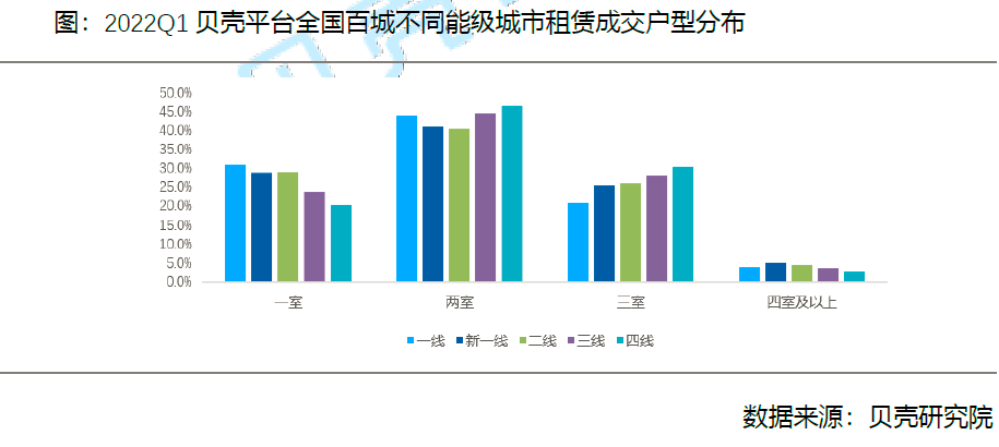 居室方面,随着城市能级提高一居室成交占比增加,三居室占比减少。根据贝壳研究院数据,各能级城市租赁成交中二居室占比最高,均超过40%,一居室和三居室占比差异较大,一线城市一居室成交占比最高,超过30%,其次是新一线城市和二线城市分别达到近30%,四线城市一居室成交占比最低为20.4%;三居室成交占比最高的为四线城市,超过30%,随着能级提高,三居室占比逐步降低,一线城市三居室占比最低为20.8%。从季度环比和同比来看,不同居室成交占比差异不大,各能级城市居室成交结构相对稳定。