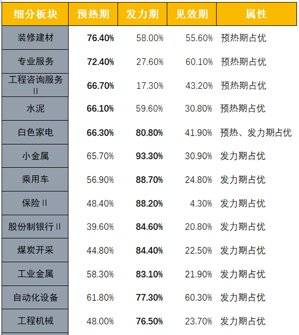 在预热期占优但随后表现逐渐趋弱的行业有专业服务、装修建材、工程咨询和水泥,当投资者意识到基建开始发力时,会优先考虑这四个细分领域;白色家电也会作为地产链的首选;随着发力期到来,基建、房地产和制造业投资开始启动,白色家电、商用车、乘用车、汽车零部件等耐用消费品随着地产销售改善而有明显的超额收益。