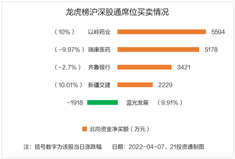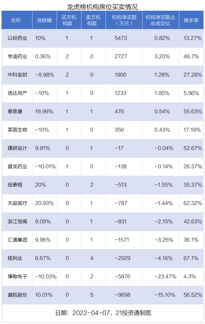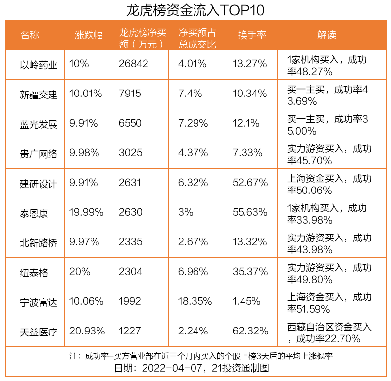 4月7日,上证指数下跌1.42%,深证成指下跌1.65%,创业板指下跌2.1%。盘后龙虎榜数据显示,共有44只个股因当日异动登上龙虎榜,资金净流入最多的是以岭药业(002603.SZ),达2.68亿元。